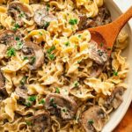 A classic and creamy Beef Stroganoff recipe made with seared flank steak, sautéed mushrooms and onions, and a rich garlicky sauce, served over tender wide egg noodles. Ready in just 30 minutes, this comforting dish is perfect for a quick weeknight dinner.
