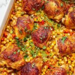 Baked Tomato Chicken Thighs with Couscous is a flavorful, comforting one-dish meal that combines tender, spiced chicken with a vibrant medley of vegetables and pearl couscous. Infused with Middle Eastern and Mediterranean spices like baharat and turmeric, and finished with fresh lemon and tarragon, this recipe yields crispy-skinned chicken and a perfectly cooked couscous, ideal for family dinners or entertaining guests.