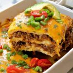 This Beef Enchilada Casserole is a hearty and flavorful Mexican-inspired layered dish featuring seasoned ground beef, black beans, diced green chiles, and a luscious blend of cheddar and Monterey Jack cheeses. Baked to perfection and topped with fresh avocado, tomato, cilantro, and jalapeno, this casserole is perfect for a family dinner or potluck.