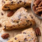 Deliciously flaky Chocolate Pecan Scones loaded with rich chocolate chips and crunchy pecans, perfect for breakfast or brunch. These scones combine a tender crumb with a warming touch of cinnamon and a delicate sweetness, finished with a light dusting of confectioners' sugar.