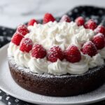 A decadent Chocolate Raspberry Torte featuring a rich, dense chocolate cake base layered with fresh raspberry puree and topped with light, airy whipped cream. Perfect for a special dessert that balances intense chocolate flavor with tart raspberries.