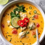 This Thai-inspired Coconut Lime Fish Soup is a rich, creamy, and flavorful dish featuring tender white fish simmered in a fragrant broth made with coconut milk, red curry paste, lime, and fresh tomatoes. Perfect as a nourishing main course, it balances spicy and tangy flavors for a comforting and nutritious meal.