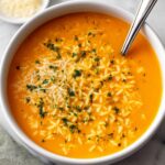 A comforting and easy-to-make Pastina Soup featuring tender tiny pasta in a flavorful vegetable-spiked chicken broth enriched with parmesan cheese. Perfect for a quick weeknight meal, this cozy soup blends pureed vegetables for added richness and is garnished with fresh parsley and grated parmesan.