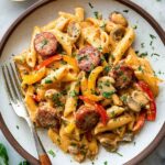 This One Pot Creamy Cajun Sausage Pasta is a flavorful and easy weeknight dinner featuring spicy andouille sausage, sautéed mushrooms and bell peppers, tender gluten-free penne pasta, and a rich creamy sauce made with cream cheese and Cajun seasoning. Ready in just 30 minutes, it's a comforting, all-in-one dish perfect for busy evenings.