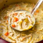 This creamy chicken noodle soup is a comforting and hearty dish featuring tender vegetables, flavorful herbs, and shredded chicken in a rich, creamy broth. The addition of potato adds body and smoothness, making it a filling meal perfect for any day.