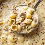 Garlic Parmesan Chicken Chowder is a rich and comforting soup featuring tender chicken, small shell pasta, and a creamy, garlicky Parmesan cheese broth. This hearty chowder is perfect for a cozy weeknight dinner and comes together in just over 30 minutes, delivering a satisfying meal packed with flavor.