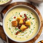 A classic and creamy leek and potato soup featuring tender potatoes and sweet leeks simmered in chicken stock, finished with rich cream and topped with crispy pancetta, croutons, and fresh chives for a comforting and delicious meal.
