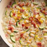This creamy one-pot lemony leek and zucchini butter beans recipe combines crispy bacon, tender vegetables, and a luscious sauce made with sour cream, parmesan, and za’atar for a flavorful and satisfying meal that can be prepared in under 30 minutes.