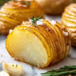 Crispy and flavorful Hasselback potatoes, thinly sliced to fan out during baking, brushed with a garlic and rosemary-infused olive oil for a perfect side dish with crispy edges and soft interiors.