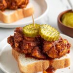 - Serve: Place the hot chicken pieces on slices of white bread and serve with sliced pickles on toothpicks for that iconic Nashville Hot Chicken experience.