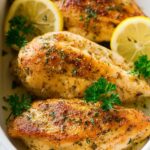 - Garnish and Serve: Spoon the pan sauce over the baked chicken, sprinkle with chopped parsley, and garnish with lemon slices if desired. Serve hot.