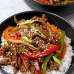 - Sauté Aromatics and Vegetables: In the same pan, add 1 Tbsp sesame oil. Add minced garlic and ginger and stir fry for about 30 seconds until fragrant. Then add the onion and bell peppers; stir fry for 3-4 minutes until vegetables are crisp-tender.