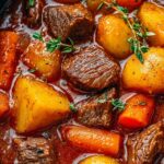 A hearty and comforting Easy Homemade Beef Stew made with tender beef chuck, fresh vegetables, and a flavorful broth. This stew is slow-cooked to perfection in the oven, perfect for cozy meals.