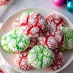 Festive and colorful Christmas Crinkle Cookies made easily with a white cake mix, vibrant red and green food coloring, and a powdered sugar coating, perfect for holiday celebrations.