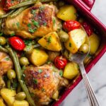 - Bake: Place the dish on the middle oven rack and bake at 375°F (190°C) for 25 minutes. After this, baste the chicken and vegetables with the cooking juices from the pan. Continue baking for an additional 25 minutes or until the potatoes are fork-tender. If needed, bake for 5-10 more minutes depending on potato size and oven calibration. Note that the cooking liquid will reduce and thicken slightly during baking.