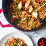 A vibrant and flavorful one pot ginger chili chicken orzo recipe that combines tender chicken thighs with fragrant ginger, garlic, chili, and fresh scallions. This easy-to-make dish features Asian-inspired seasonings like soy sauce, fish sauce, and chili oil, delivering a satisfying and colorful meal perfect for a quick weeknight dinner.
