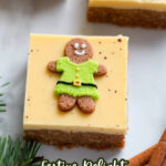 - Chill and Serve: After cooling in the oven, refrigerate the cheesecake for 2 hours to overnight. Remove from the pan using the parchment paper overhang and cut into bars. Garnish as desired with mini gingerbread cookies or festive sprinkles before serving.