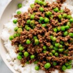 Gingery Ground Beef (Soboro Donburi) is a savory Japanese-inspired dish featuring ground beef cooked with fresh ginger, soy sauce, and sweet brown sugar, complemented by tender peas. It pairs perfectly over steamed rice for a comforting and quick weeknight meal.