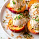 - Plate and serve: Once cool enough to handle but still warm, arrange the peaches on serving plates. Top each half with a scoop of vanilla ice cream and drizzle with caramel sauce. Sprinkle with roasted pistachios, fresh mint, and a pinch of finishing salt for added flavor and texture. Serve immediately.