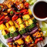 These Hawaiian Grilled Teriyaki Chicken Pineapple Skewers combine juicy marinated chicken thighs with sweet pineapple chunks and vibrant vegetables like red onion and bell peppers. Marinated in a flavorful teriyaki glaze with soy sauce, honey, lime juice, garlic, ginger, and smoked paprika, then grilled to perfection for a delicious, colorful, and satisfying meal perfect for summer dinners, BBQs, or meal prepping.