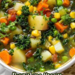 A comforting and wholesome vegetable soup packed with leeks, carrots, parsnips, celery, potatoes, peas, and kale simmered in a savory herb-infused broth, perfect for a hearty and healthy meal.