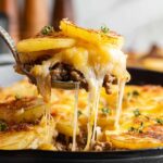 - Prepare Potatoes Peel and slice the potatoes into even slices. Layer the potato slices evenly on top of the cooked ground beef in the skillet.