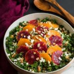 - Add Toppings: Top the dressed salad with the remaining toasted almonds, green onions, blood orange slices, and crumbled goat cheese.