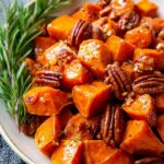 - Serve and Garnish: Remove the sweet potatoes from the oven and transfer them to a serving bowl or platter. Garnish with chopped candied pecans or walnuts if desired. Serve immediately for best flavor and texture.