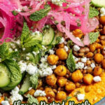 Grab your bowls and start by scooping a generous dollop of the feta sauce on one side—don’t be shy, make it pretty! Add a half cup of cooked rice opposite the sauce. Top the sauce with roasted chickpeas for crunch, then pile the spiced chicken in the center. Add fresh cucumber slices and tangy pickled red onions on top. Finish with a drizzle of olive oil, extra feta crumbles, fresh mint, and parsley. Serve alongside warm torn pita bread—trust me, scooping with pita makes the experience so much more fun!