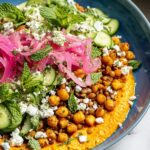 - Assemble the Bowls: In a shallow bowl, spoon a generous amount of the feta sauce on one side. Add a ½ cup scoop of cooked rice on the other side. Top part of the feta sauce with ¼ cup roasted chickpeas. Add a scoop of the spiced ground chicken in the center. Garnish with sliced Persian cucumbers and pickled red onion. Drizzle with extra-virgin olive oil and sprinkle crumbled feta, fresh mint leaves, and chopped parsley on top.