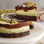 A luscious no-bake Dubai chocolate cheesecake featuring a rich chocolate cookie crust, a crispy kataifi pistachio knafeh layer, smooth cream cheese filling with pistachio cream, and a decadent chocolate ganache topping. This layered dessert combines textures and flavors to create a creamy, nutty, and chocolatey treat that requires no oven baking, making it perfect for any occasion.