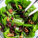 - Add toppings: Sprinkle the roughly chopped pecans and dried cranberries evenly on top of the dressed spinach.