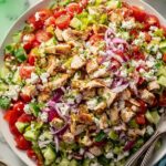 - Assemble the Salad: Cut the rested grilled chicken into bite-sized chunks and transfer them to a large serving bowl. Add the chopped vegetables, crumbled feta cheese, the remaining half of the dressing, and chopped parsley if using. Toss everything gently to coat the salad evenly with the dressing.