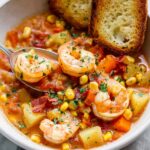 A hearty and flavorful Shrimp and Chorizo Chowder combining the smoky richness of Spanish chorizo with tender shrimp, creamy half and half, and a medley of vegetables simmered to perfection in a paprika-spiced broth. Perfectly served with toasted baguette for dipping.