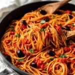 Pasta Puttanesca is a flavorful Italian pasta dish made with a savory tomato sauce infused with anchovies, capers, olives, garlic, and red pepper flakes. This quick and easy recipe yields a rich, tangy sauce served over al dente spaghetti, perfect for a satisfying weeknight dinner.