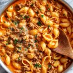 This delicious one-pot Taco Pasta recipe combines seasoned ground beef, tender pasta shells, and a creamy cheese sauce filled with cheddar, Monterey Jack, and Velveeta cheeses. It’s a comforting, flavorful dish perfect for a quick dinner with minimal cleanup.