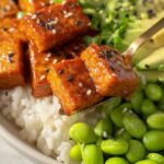- Assemble Bowls: Divide cooked rice into bowls, add tofu with sticky sauce, steamed edamame, and sliced avocado. Garnish with optional sesame seeds and spring onions. Drizzle with remaining sauce if desired. Serve immediately and enjoy!