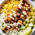 This Street Corn Chicken Rice Bowl combines tender, marinated chicken thighs with smoky grilled corn, creamy Cotija cheese, and a tangy lime sauce for a flavorful and satisfying meal. Served over a bed of fluffy rice and garnished with fresh cilantro and lime wedges, this bowl is perfect for a quick weeknight dinner or a casual lunch. Customize with your favorite toppings like avocado or black beans for a personal touch.
