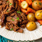 This pot roast is a hearty one-pot meal, but if you want to round it out, consider serving it with creamy mashed potatoes or buttery dinner rolls to soak up the flavorful broth. A crisp green salad with a light vinaigrette or steamed green beans also offer a nice contrast to the rich, slow-cooked beef and vegetables.
