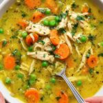 This Anti Inflammatory Turmeric Chicken Soup is a nourishing, one-pot recipe made with leeks, onions, carrots, celery, and peas simmered in a flavorful broth infused with turmeric, garlic, and poultry seasoning. Enriched with coconut milk and tender chicken, this soup is perfect for meal prep or a comforting family dinner. It is dairy-free, paleo, gluten-free, and offers a vegetarian option.