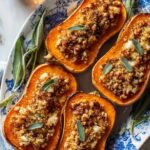- Prepare Topping: In a small bowl, combine pecans, panko breadcrumbs, remaining 3 Tbsp. Parmesan, 2 Tbsp. olive oil, and a pinch of salt. Mix well. Scatter topping over filled squash halves. Optionally, rub remaining sage leaves with olive oil and scatter over topping for crispy garnish.